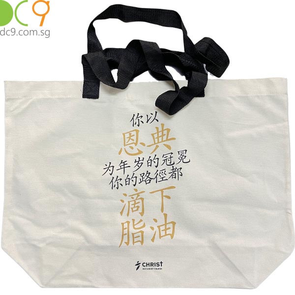 ✍️ Project Descriptions: Large custom tote bag printed for Christ Methodist Church for use as Chinese New Year goodie bag. This side of the extra large canvas bag was printed in Chinese and with black and shimmering gold. Do engage us for your next canvas bags printing if you are looking for a tote bag printer in Singapore.