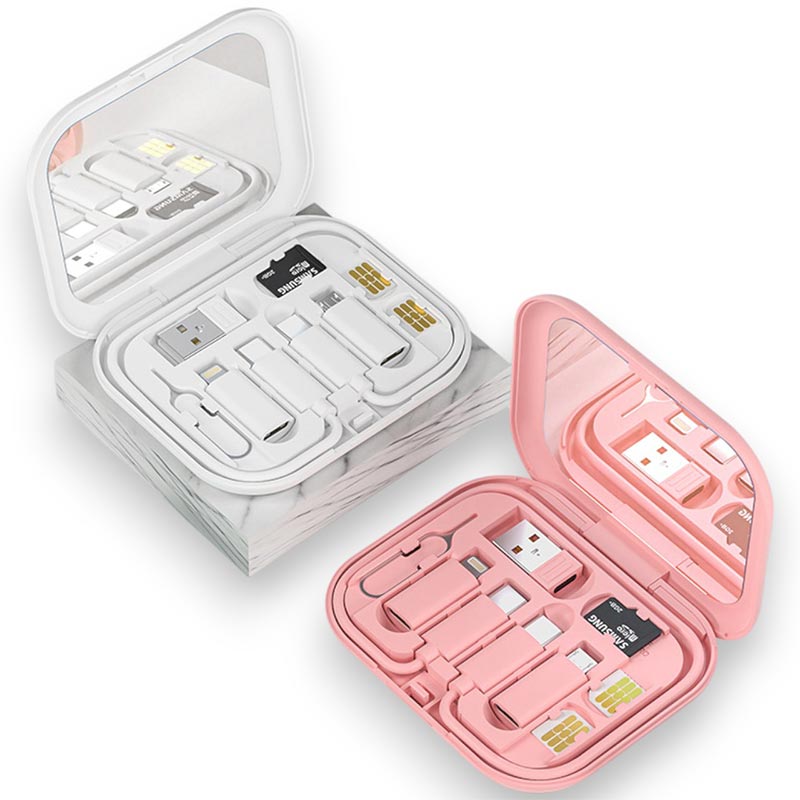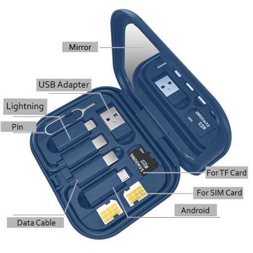 Designed for frequent travellers and tech users, it includes a Type-C to Type-C charging cable, USB, Lightning, and Micro USB adapters, SIM card slots, and even a handy built-in mirror — all in one organised travel box.